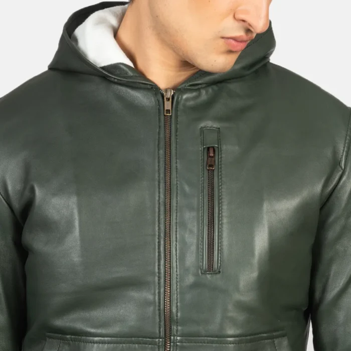 Stay stylish and warm with the Baston Green Hooded Leather Bomber Jacket, featuring premium leather, a detachable hood, and a bold green design perfect for any occasion.
